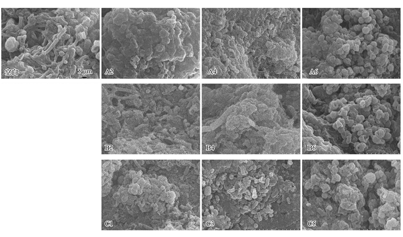 根據(jù)3.1節(jié)中的COD去除率變化選擇具有代表性的濃度組(A組:A2、A4、A6;B組:B2、B4、B6;C組:C1、C3、C5)進(jìn)行各項(xiàng)指標(biāo)的測定.圖 2為放大10000倍后的顆粒污泥的掃描電鏡圖.由圖 2可見,空白組厭氧顆粒污泥表面幾乎為8~25 μm長的桿狀菌,伴隨有少量的球菌,污泥表面凹凸不平孔隙交錯(cuò),是內(nèi)部微生物能量代謝的重要通道.在高濃度的亞硝氮、硝氮和氨氮(A6、B6和C5)作用下,厭氧顆粒污泥的表面結(jié)構(gòu)都發(fā)生明顯變化,污泥表面的主要細(xì)菌由桿狀菌變?yōu)榍驙罹瑤缀醪灰姉U菌.低濃度抑制作用下,污泥表面主要細(xì)菌為桿菌和球狀菌,且與空白組相比桿菌比例明顯降低.