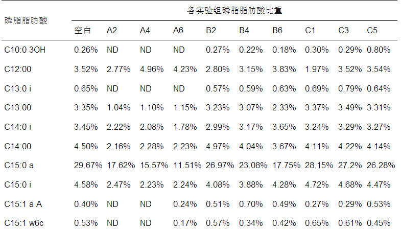 各組樣品的PLFA組成情況如表 2所示,其中,在各組樣品中含量比均低于0.5%的PLFA因含量過低而不具體列出,磷脂脂肪酸的碳鏈長度主要分布在C10~C20之間,共檢測到31種類型的磷脂脂肪酸,其中,占主要比重的磷脂脂肪酸為C15:0 a和C16:00.表 2中,與空白相比,A組和B組中的C15:0 a含量隨著抑制物質(zhì)濃度的升高呈現(xiàn)下降趨勢,而C15:0 a在指示厭氧細(xì)菌和革蘭氏陽性菌的PLFA中占有較高負(fù)荷.C組的C17:1 w8c與空白相比隨著抑制物質(zhì)濃度升高呈現(xiàn)下降趨勢,且C17:1 w8c為指示革蘭氏陰性菌的PLFA的主要因子.
