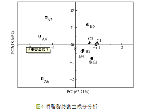 由圖 4可以看出,PC1反映了不同抑制物質(zhì)對(duì)PLFA的影響,PC2反映了不同抑制濃度對(duì)PLFA的影響.主成分分析顯示,各樣品間有較明顯的差異,A2、A4、A6、B6與空白之間的差異度較大,剩余樣品與空白之間的差異度相對(duì)較小.厭氧微生物的PLFA對(duì)亞硝氮的敏感度最高,即使低濃度的亞硝氮(A2)也會(huì)引起PLFA較大的變化;與亞硝氮不同,高濃度硝氮(B6)會(huì)引起PLFA較大變化,而低濃度(B2和B4)下與空白的差異度較小;氨氮(C1、C3和C5)對(duì)厭氧微生物PLFA的影響相對(duì)前兩者較小,且在濃度梯度上變化不大.