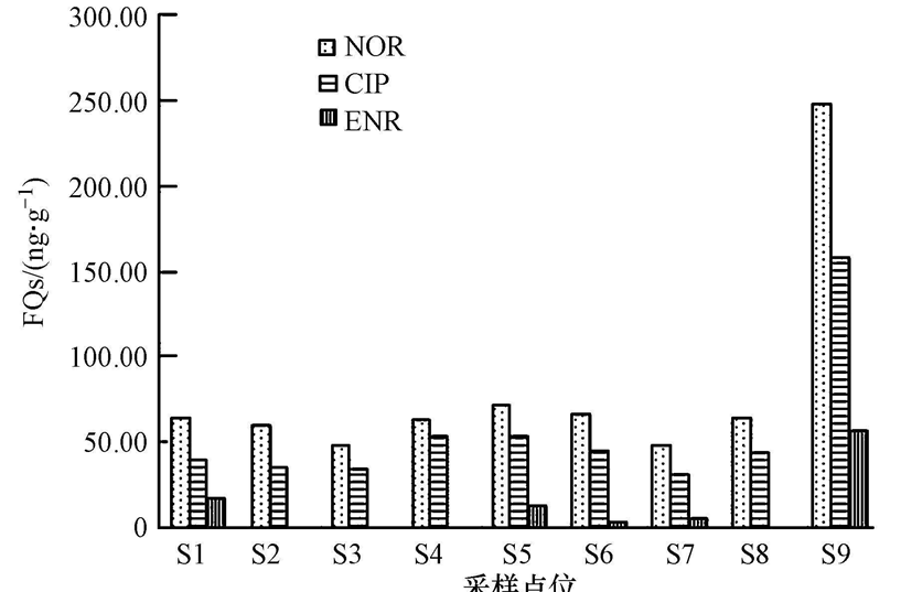 從圖 1可見,9個采樣點均可檢測到NOR和CIP,S2、S3、S4、S8均未檢測到ENR.各樣點FQs含量均為NOR>CIP>ENR.S9的FQs含量最高,NOR含量最高為248.25 ng · g-1,CIP最高為158.69 ng · g-1,ENR最高為56.81 ng · g-1.