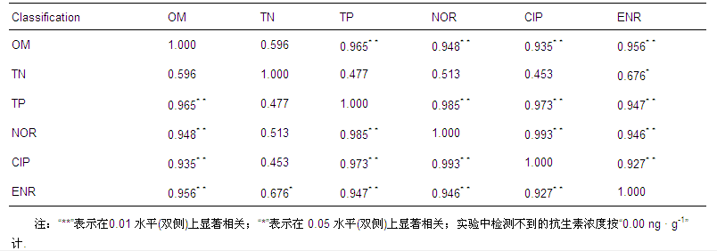 對FQs與沉積物性質(zhì)進行Person相關(guān)性分析(表 1),NOR與OM、TP相關(guān)性極顯著,相關(guān)系數(shù)(r)分別為0.948、0.985(p<0.01);CIP與OM、TP相關(guān)性極顯著,r分別為0.935、0.973(p<0.01);ENR與OM、TP相關(guān)性極顯著,r分別為0.956、0.947(p<0.01),與TN相關(guān)性顯著,r為0.676(p<0.05).NOR、CIP與ENR之間相關(guān)性極顯著,r最小為0.927(p<0.01).