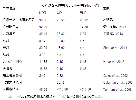 將本研究結(jié)果與目前國內(nèi)外河流沉積物中FQs的含量進行比較,見表 3.