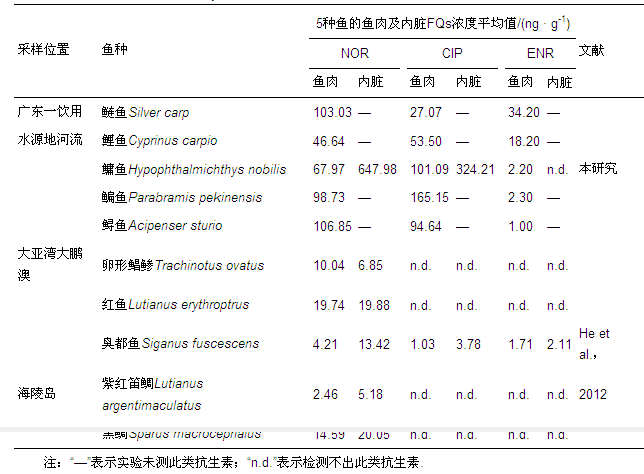 本研究測得5種魚的魚肉中的FQs含量均顯著高于大亞灣大鵬澳和海陵島中魚的FQs的含量;部分魚類魚肉和內(nèi)臟中NOR、CIP含量高于美國、歐盟的許多國家的殘留標準(殘留限量為30 ng · g-1),也高于我國農(nóng)業(yè)部標準NY 5070—2001《無公害食品水產(chǎn)品中漁藥殘留限量》的殘留標準(NOR、CIP殘留限量為50 ng · g-1).分析原因乃為同上,主要是養(yǎng)殖魚塘、禽畜養(yǎng)殖業(yè)、城鎮(zhèn)生活污水及感潮河流的滯留效應(yīng),導致面源污染嚴重,水體中可能含有較高的FQs含量.Li的研究表明FQs在可食用的軟體動物內(nèi)臟中性質(zhì)穩(wěn)定(Li et al., 2012);孫言春的研究也表明FQs在魚體內(nèi)吸收較快,消除較慢,F(xiàn)Qs在魚體內(nèi)富集作用較強.魚內(nèi)臟部位為代謝器官,因此,更易積累,造成魚內(nèi)臟中抗生素含量較高的現(xiàn)象.魚體內(nèi)臟中FQs含量多數(shù)情況下高于魚肉中FQs含量,這個結(jié)果與He的研究結(jié)果一致.