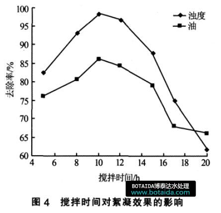 由圖4 可知,攪拌時間約10 min 時,絮凝效果最好?攪拌時間過長,將使本應該沉淀的顆粒又分散成不能沉淀的細小顆粒,降低了絮凝效果;而攪拌時間過短,則會使絮凝劑和顆粒物不能充分接觸及吸附,從而不利于絮凝劑對膠體顆粒的捕集, 使絮凝劑的效能不能充分發(fā)揮.
