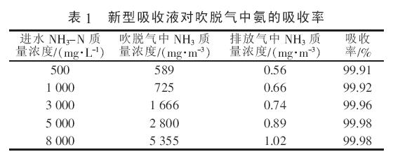 由表1 可知, 新型吸收液可高效去除不同氨氮濃度廢水吹脫氣中的氨,去除率達99.9%以上,吸收后排放氣中的氨質量濃度最高為1 mg/m3 左右,全能滿足《惡臭污染物排放標準》(GB 14554—1993)中氨排放標準。