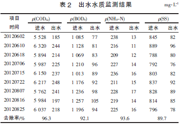 系統(tǒng)經(jīng)過(guò)2個(gè)月調(diào)試后,各項(xiàng)測(cè)試指標(biāo)均達(dá)到污水處理廠的接管標(biāo)準(zhǔn)。運(yùn)行結(jié)果表明,該系統(tǒng)運(yùn)行穩(wěn)定,抗沖擊負(fù)荷能力強(qiáng)。環(huán)保部門(mén)抽檢及企業(yè)自檢結(jié)果顯示,廢水各項(xiàng)指標(biāo)均穩(wěn)定達(dá)標(biāo)。近期運(yùn)行數(shù)據(jù)見(jiàn)表2。由表2 可見(jiàn),廢水經(jīng)過(guò)“預(yù)處理-UASB-二級(jí)接觸氧化”工藝處理后,平均去除效率分別為CODCr96.3%,BOD5 92.1%,NH3-N 93.6%,SS 89.7%,出水監(jiān)測(cè)指標(biāo)均優(yōu)于接管標(biāo)準(zhǔn)。