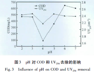 分別量取300 mL 廢水,并分別調(diào)節(jié)廢水pH =2、3、4、5、6、7,然后加入到500 mL 的光化學(xué)反應(yīng)器中,再加入FeSO4·7H2O 顆粒,將光化學(xué)反應(yīng)儀磁力攪拌調(diào)節(jié)到1 000 r /min,開啟磁力攪拌,使其充分溶解均勻,再加入28 mL 的雙氧水,同時(shí)通入臭氧,開啟光化學(xué)反應(yīng)儀反應(yīng)30 min,停止反應(yīng)取樣測定處理后水樣的COD 和UV254,COD 和UV254的降解情況如圖3 所示。由圖3 可以看到,當(dāng)pH=4,廢水的COD 和UV254都是降到最低,分別為357 mg /L 和1.67 cm-1。pH 一直影響是Fenton 反應(yīng)的一個(gè)重要因素,傳統(tǒng)的Fenton 最佳pH 一般在3 左右。這在一定程度上影響了Fenton 法的工業(yè)應(yīng)用,因?yàn)橐獙U水的pH 調(diào)節(jié)到酸性條件下,增加了藥劑成本。由此可知道廢水降解最佳pH=4。