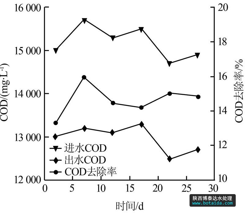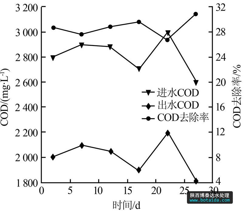 由圖 4可以看出,UASB工藝對COD的去除率基本穩(wěn)定在30%左右,出水COD約為2 000 mg/L。