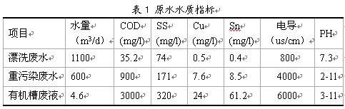 某電子公司是國內(nèi)重點(diǎn)集成電路封裝測試企業(yè),該公司主要從事半導(dǎo)體集成電路、半導(dǎo)體元器件的封裝測試業(yè)務(wù),其生產(chǎn)線廢水主要包括兩部分,一部分為晶元的減薄劃片廢水、另一部分為電鍍錫化廢水。減薄劃片廢水中主要含有大量的硅粉微粒,SS約2000mg/L左右,特性很穩(wěn)定,不易沉降,電導(dǎo)率僅為2-4µs/cm,東洋采用自主研發(fā)的二級連續(xù)UF膜系統(tǒng)進(jìn)行進(jìn)行廢水回收利用,廢水回收利用率≥90%,回收水質(zhì)好,同時回收硅粉。在此主要介紹電鍍錫化廢水的回用處理系統(tǒng);廢水中主要含有Cu、Sn、酸堿、有機(jī)物等,在該項目中首先要做好分質(zhì)分流是尤為重要,把錫化電鍍線上的廢水按照水中的成份及濃度來分質(zhì)收集,主要分為漂洗廢水、重污染廢水、有機(jī)槽廢液三路,水質(zhì)如下: