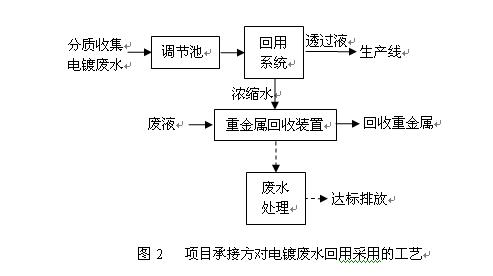 經(jīng)過多年電鍍廢水及涉重金屬的研究及工程實(shí)踐,摸索出一套成熟穩(wěn)定的電鍍廢水回用技術(shù)(連續(xù)錯流抗污染多級膜法回用),把電鍍廢水分質(zhì)收集,單獨(dú)膜法回用,回用水可分別用到對應(yīng)的生產(chǎn)線或作為自來水使用;目前項目承接方采用的回用理念是“先回用后處理”,把廢水先進(jìn)行分質(zhì)收集,單獨(dú)膜法回用,回收率≥85%,濃縮后的廢水中重金屬離子濃度可提升到100倍以上,對該濃縮廢水可通過重金屬回收裝置(專利號:CN201010578758.5)進(jìn)行重金屬的提取,大大提高了重金屬的回收效率,回收重金屬的同時,也減輕后需廢水處理的負(fù)荷。