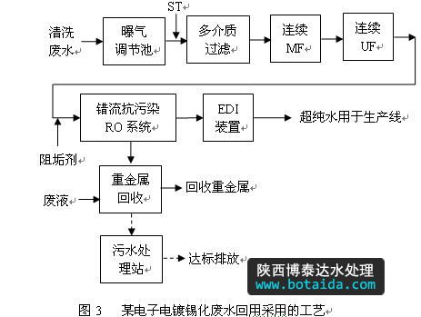 工藝說明:清洗廢水主要包括酸性清洗廢水及堿性清洗廢水兩大部分,廢水中主要含有硫酸、硫代硫酸鈉、甲基磺酸、堿性液、銅、錫及添加劑等,混合后的清洗水主要偏酸性,多路清洗廢水匯集于調(diào)節(jié)池,通過曝氣攪拌,使水質(zhì)水量達(dá)到調(diào)節(jié)作用,調(diào)節(jié)后的水進(jìn)入多介質(zhì)過濾系統(tǒng)主要是攔截較大顆粒物及膠體,然后進(jìn)入MF/UF(可選項),主要去除較小懸浮物、膠體、細(xì)菌微生物等,MF/UF具有自動運(yùn)行、沖洗功能;MF/UF透過液進(jìn)入膜脫鹽系統(tǒng),主要是脫除水中鹽份,該膜元件是根據(jù)電鍍廢水的特性,采用連續(xù)錯流抗污染技術(shù),少量的濃縮水中含有較高的重金屬,先進(jìn)行重金屬回收(若較貴重的重金屬可分開收集單獨(dú)回收重金屬,達(dá)到純度更高的重金屬),再把回收后的廢水供至污水站進(jìn)行物化或生化處理達(dá),最終確保出水水質(zhì)達(dá)到《電鍍污染物排放標(biāo)準(zhǔn)》(GB21900-2008)指標(biāo)。