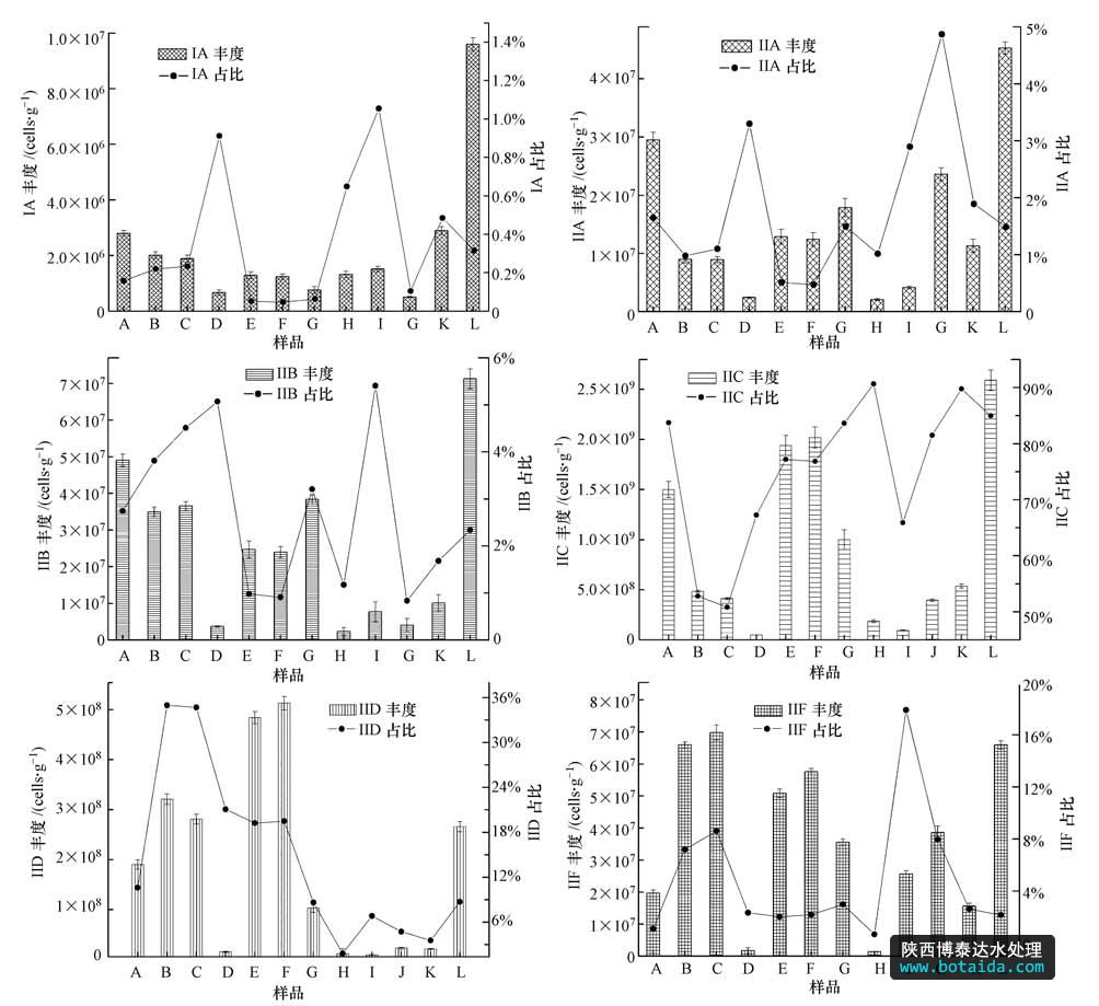 采用實時定量PCR定量分析Accumulibacter(I、IIA、IIB、IIC、IID、IIF)6個分支的豐度,結(jié)果如圖 1所示.Accumulibacter 6個分支均為單拷貝基因,即Accumulibacter的細胞數(shù)為ppk1基因的拷貝數(shù).總Accumulibacter的定量變化范圍為7.32×107(D)~3.05×109 cells · g-1(L),平均為1.20×109 cells · g-1(以MLSS計).在12個樣品中,只有D樣品數(shù)量級為107,比其他樣品低1~2個數(shù)量級,其中的Accumulibacter ppk1基因含量偏低;有6個樣品數(shù)量級為108,分別為H、B、C、I、J和K;樣品A、E、G、F和L的數(shù)量級為109,這5個樣品中的Accumulibacter的ppk1基因含量高于其他樣品,其中樣品L(A2O工藝)含量最高,達到了3.05×109 cells · g-1(以MLSS計).12個樣品中Accumulibacter占總菌的百分比變化范圍為0.58%~ 22.77%,平均為9.17%(圖 1).