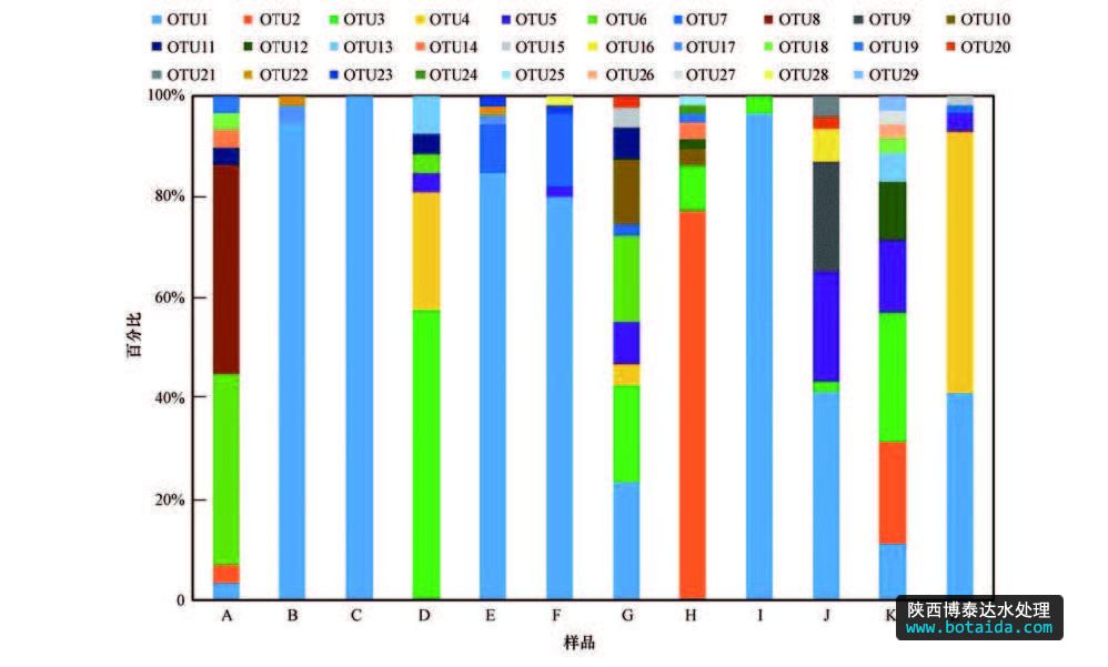 OTU1共出現(xiàn)12次,即每個樣品中都有序列出現(xiàn)在OTU1中,同時還是樣品B、C、E、F、F、I和J共6個克隆文庫中的優(yōu)勢OTUs.OTU3和OTU5在6個樣品中出現(xiàn),尤其在樣品H的克隆文庫中分布廣泛.OTU7出現(xiàn)了4次.有4個OTUs共出現(xiàn)3次,分別為OTU2、OTU4、OTU6和OTU11.上述8個OTUs為Accumulibacter的主要種屬.有10個OTUs(OTU10、OTU12、OTU13、OTU15、OTU17~ OTU20、OTU22、OTU23)出現(xiàn)2次,有11個(OTU9、OTU10、OTU14、OTU16、OTU21、OTU24~ OTU29)共出現(xiàn)1次,這21個OTUs中每個OTUs包含1~2條ppk1序列,不是Accumulibacter的主要種屬.