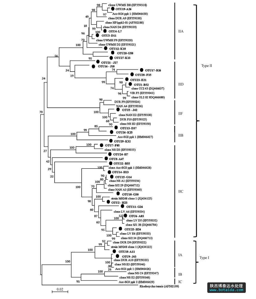 結(jié)合圖 4和圖 5可知,IIA包含6個OTUs(88條序列),IIB包含3個OTUs(6條序列),IIC包含11個OTUs(124條序列),IID包含4個OTUs(315條序列),IIF包含1個OTU(共23條序列).其中,優(yōu)勢OTUs(OTU1~OTU3)分別隸屬于IID、IIC、IIA.QPCR和PCR-Cloning-Sequencing的研究結(jié)果都證實了12種污水處理工藝中Type I豐度很低,主要以 Type II為主,且IIA、IIC、IID是系統(tǒng)中的優(yōu)勢分支.