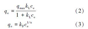 其中,qe為吸附平衡吸附量(mg · g-1),qmax為吸附劑飽和吸附量(mg · g-1),ce為平衡時溶液中剩余磷濃度(mg · L-1),kL為與熱力學(xué)有關(guān)的常數(shù)(L · mg-1),kF為與吸附強度有關(guān)的常數(shù)(L · g-1),n為與吸附能力有關(guān)的常數(shù).