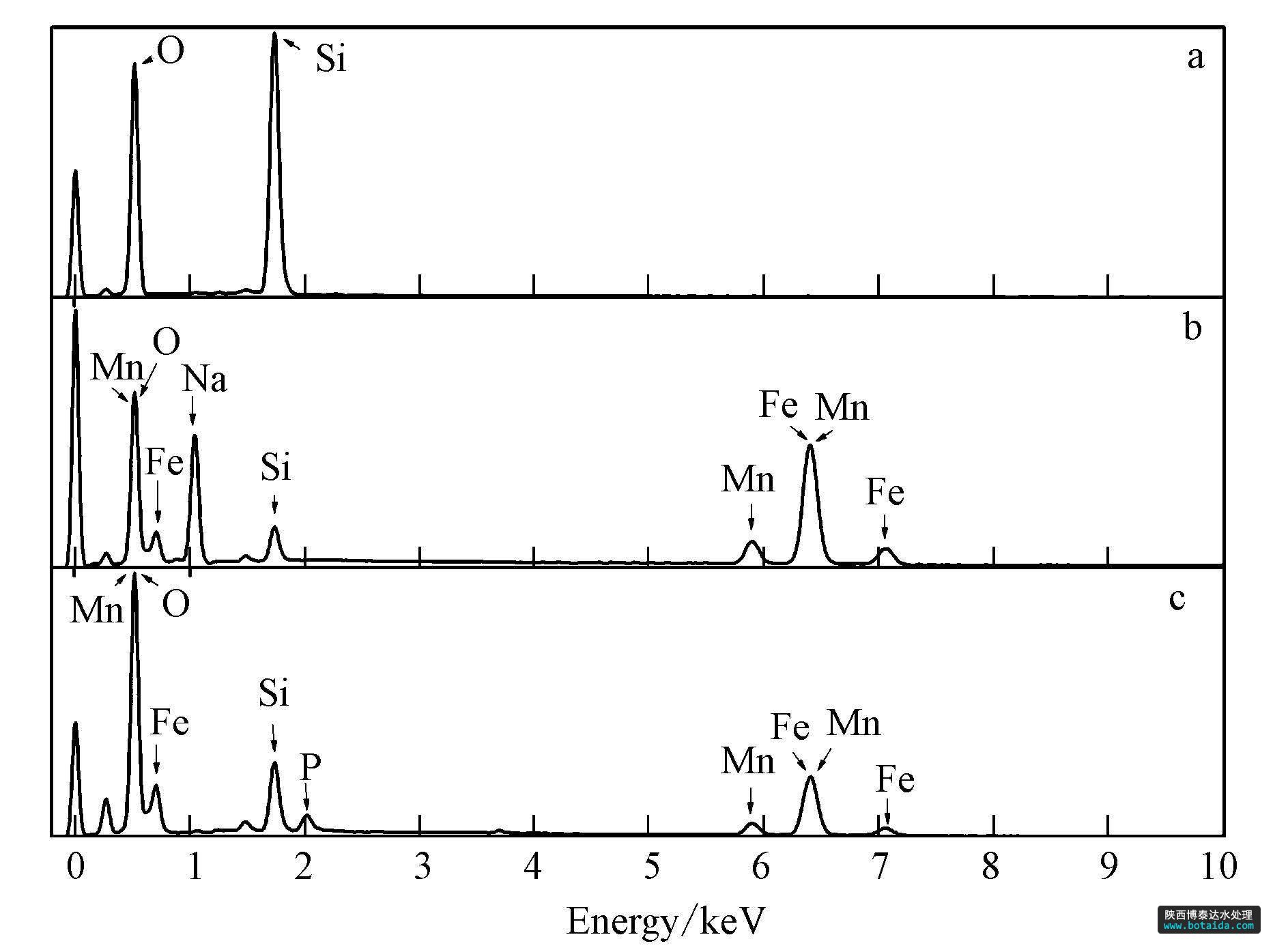 圖2 海砂與包覆海砂吸附磷前后的EDAX圖譜(a. 海砂; b. 吸附磷前的包覆海砂; c. 吸附磷后的包覆海砂)