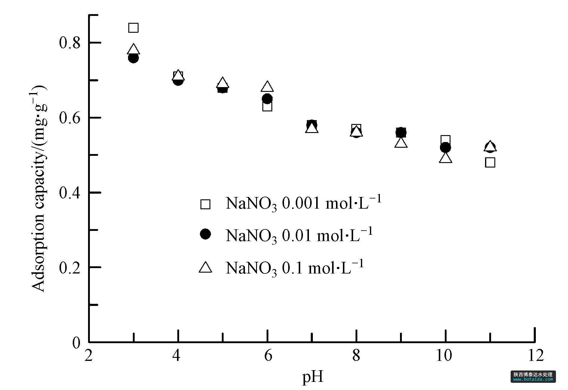 配制一系列50 mL濃度為5.0 mg · L-1磷溶液,分別投加200 mg吸附劑,考察不同pH(3.0~11.0)和不同離子強度(0.1 mol · L-1,0.01 mol · L-1,0.001 mol · L-1 NaNO3)對吸附磷的影響. 用HNO3和NaOH調(diào)節(jié)溶液pH,使pH穩(wěn)定在不同預(yù)定值.