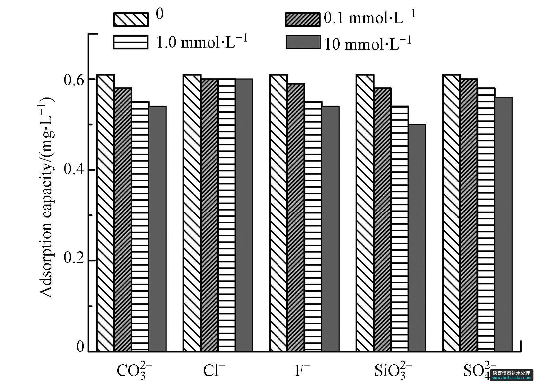 配制一系列50 mL濃度為5.0 mg · L-1磷溶液,溶液pH 7.0±0.1,分別投加200 mg吸附劑,考察Cl-、F-、CO32-、SO42-與SiO32- 5種陰離子在4種不同濃度(0 mmol · L-1,0.1 mmol · L-1,1.0 mmol · L-1,10 mmol · L-1)時對吸附磷的影響.