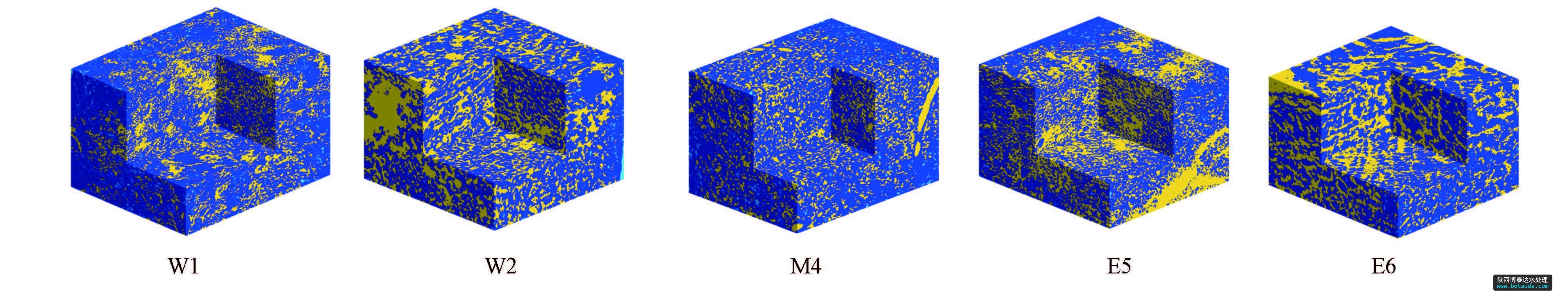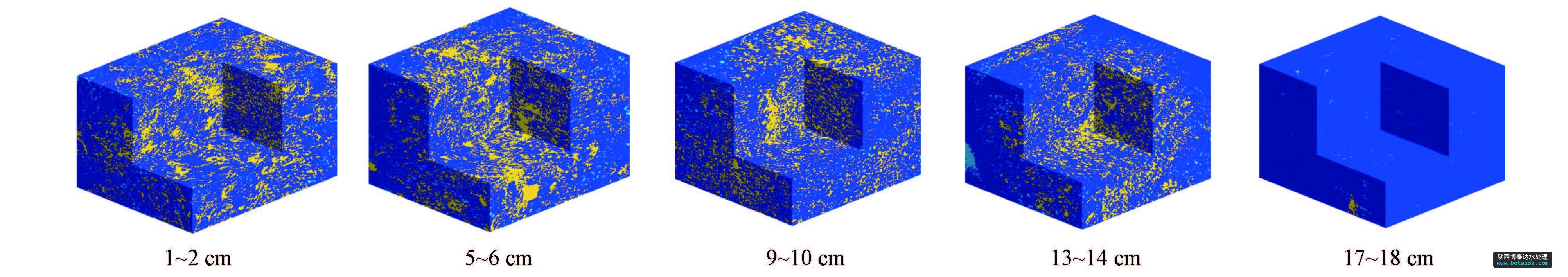 通過Mathematics軟件顯示沉積物各點(diǎn)三維孔隙結(jié)構(gòu),如圖 2所示,圖中深藍(lán)色部分為沉積物基質(zhì),黃色部分為連通孔,淺藍(lán)部分為孤立孔.