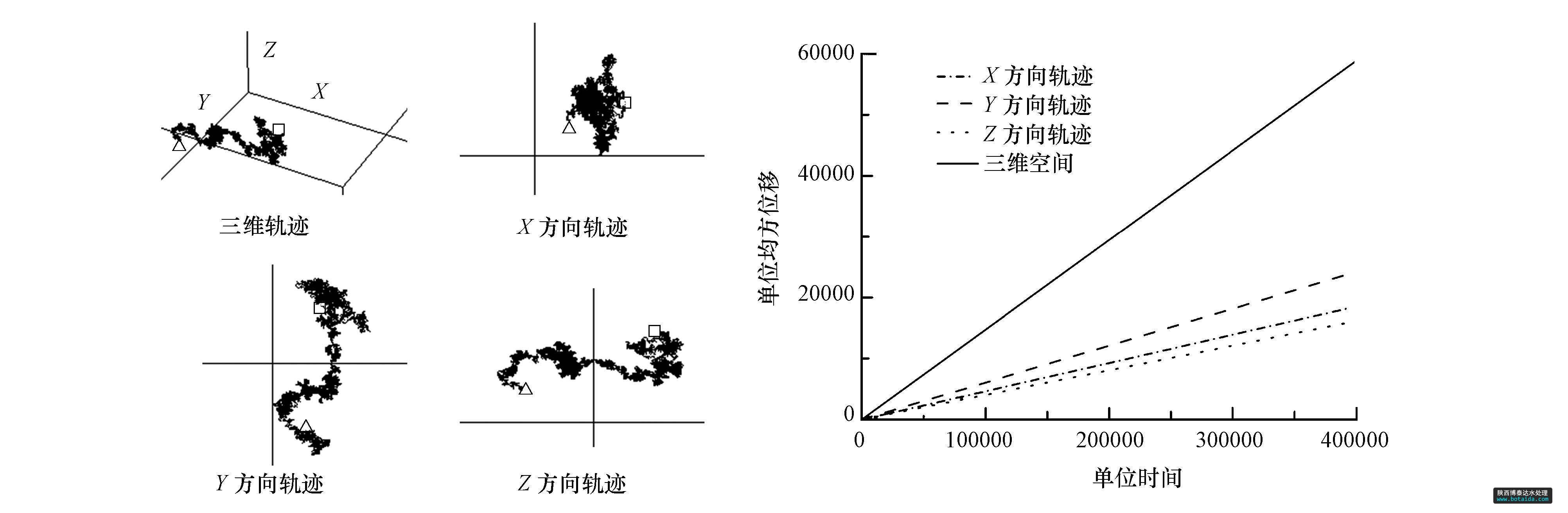 根據(jù)以上結(jié)果,利用Rwalk程序?qū)αW釉谧杂煽臻g與沉積物孔隙中的擴(kuò)散進(jìn)行隨機(jī)行走模擬,結(jié)果見圖 3(以W1點(diǎn)1~2 cm深度內(nèi)樣品為例),其中,空心方框和三角分別表示行走軌跡的起點(diǎn)和終點(diǎn).由于沉積物結(jié)構(gòu)的各向異性,根據(jù)不同方向的均方位移與時(shí)間統(tǒng)計(jì)結(jié)果可以得到不同方向的曲率值.