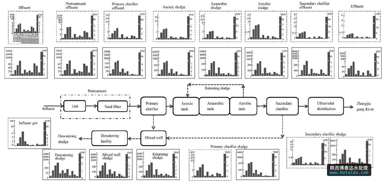 2012年4月份則采集了該廠各個(gè)構(gòu)筑物的出水和污泥樣品,采樣點(diǎn)和類型見圖 1.我們?cè)?4: 00—17: 00之間,每個(gè)小時(shí)分別采集該構(gòu)筑物的污水和污泥樣品,然后分別將污水和污泥樣品混合在一起作為一個(gè)混合樣.污水和污泥樣品是分別用干凈的棕色玻璃瓶和廣口瓶采集的,每個(gè)采集瓶上方不留空間,采集完之后立馬放入冰袋中,并運(yùn)到實(shí)驗(yàn)室保存.