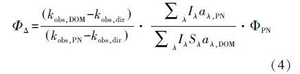 式中,Iλ表示光源在每個波長下的光照強度(W · m-2);aλ,DOM和aλ,PN分別表示腐殖酸和光敏劑在每個波長處的納氏吸收系數(shù)(m-1),可由公式(5)計算得到;Sλ是屏蔽因子,無量綱,可由公式(6)計算得到.