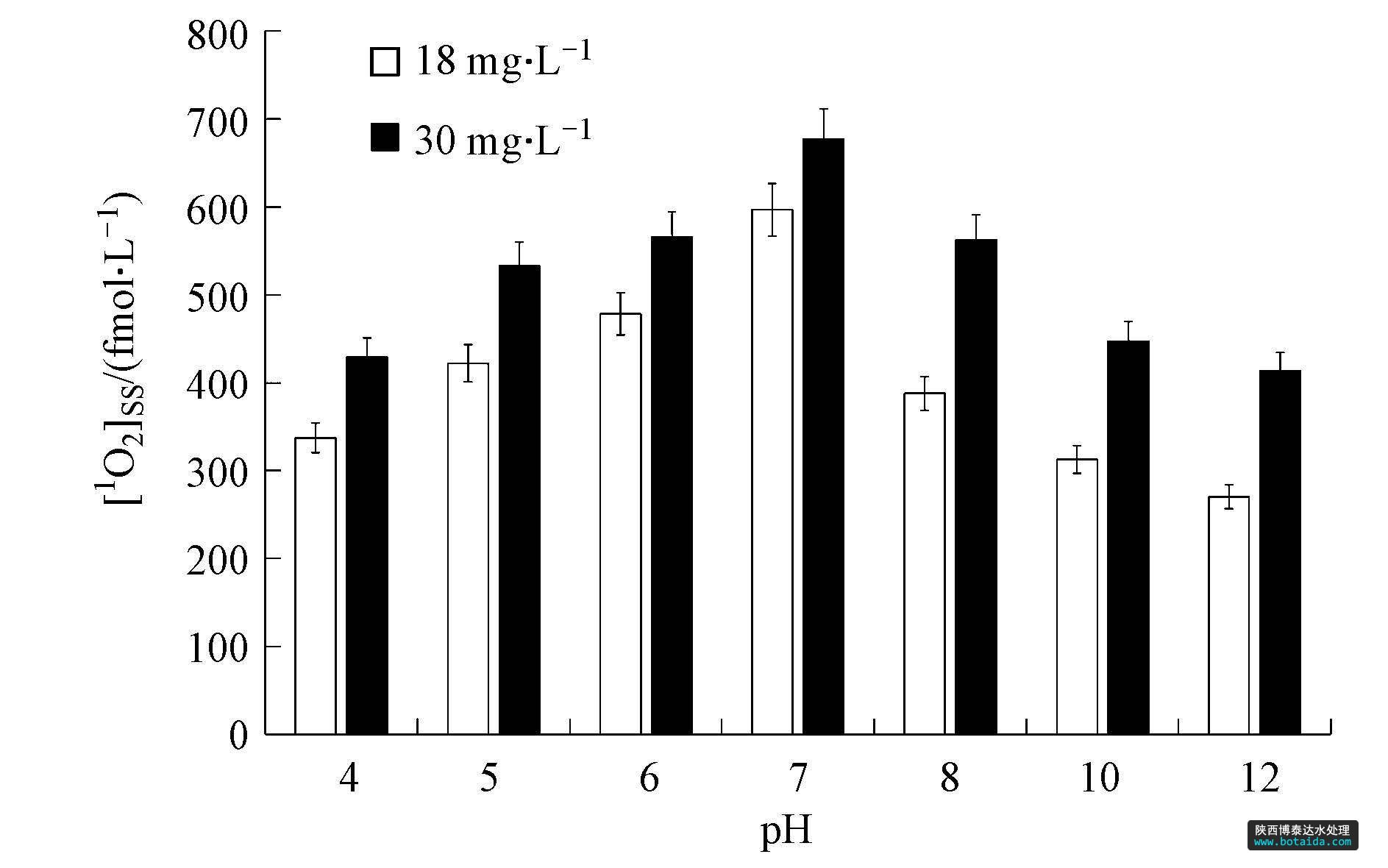 pH作為水環(huán)境中重要的理化性質(zhì)指標,對水中DOM的水化學(xué)、光化學(xué)等行為的解釋和預(yù)測具有重要作用(Frimmel et al., 1987; Dalrymple et al., 2010).圖 2為不同pH條件下,腐殖酸光敏化產(chǎn)生1O2的平衡濃度. [1O2]ss 值在pH=7的溶液中最高,其中DOC值為18 mg · L-1和30 mg · L-1的腐殖酸溶液產(chǎn)生的[1O2]ss分別為596.9 fmol · L-1和677.3 fmol · L-1.隨著酸堿性增強,[1O2]ss值逐漸減小,但弱酸環(huán)境中的[1O2]ss值較弱堿環(huán)境中的高.