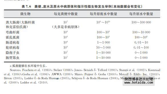 表7.6中,可以清楚地看到糞便指示菌,如大腸桿菌在廢水中常常呈現(xiàn)較高濃度。每個 人都會散布大腸桿菌,但濃度變化很大。只有被感染的人散布病原體,因此,廢水中病原體 濃度變化更大。這樣的變化取決于擴散模式,也依賴于其他因素,如排放廢水的人群規(guī)模或 被其他廢水、如工業(yè)廢水稀釋的規(guī)模。傳統(tǒng)廢水處理在廢水被排放到地表水之前,常常降低 一到兩個數(shù)量級的微生物濃度。在其他地方,原水被直接排放,或者通過排水管溢流偶爾排 放。排放廢水被受納水體稀釋,從而減少了病原體數(shù)量,稀釋因子是因地而異。病原體失 活、死亡或進(jìn)入到沉積物里也會使病原體減少。這些因子隨著表面水體和氣候的不同而變 化。這種變化說明糞便指示菌和病原體的濃度在地表水體比廢水中變化更多。