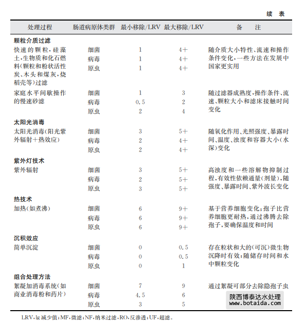 表7.8總結(jié)了采用上述幾種家庭水處理技術(shù)對水傳播細(xì)菌、病毒和寄生性原生蟲的 去除情況。這些去除信息是基于科學(xué)文獻(xiàn)報告的研究結(jié)果。有兩個有效性內(nèi)容:基本去 除和最大去除。基本去除是指由相對不熟練人員實(shí)際操作時的一般運(yùn)行效果,且操作人 員將以上方法用于處理平均水質(zhì)或可變水質(zhì)原水及現(xiàn)場只有很少應(yīng)用工具以優(yōu)化處理條 件和操作時。最大去除是指在熟練操作和優(yōu)化運(yùn)行條件下,并且在可預(yù)見和不變水質(zhì)條 件下,有相關(guān)儀器工具支持并保持最高水平運(yùn)行時達(dá)到的效果(如測試一個已知濃度和種 屬的微生物時)。應(yīng)當(dāng)該注意的是某些水處理工藝的lg減少值存在差異,如表7.8中的 家庭水處理和表7.7中的集中處理。這種相同處理技術(shù)、不同的運(yùn)行效果差異是可以理 解的。因?yàn)榧刑幚硭盟ǔM足處理工藝所需要的質(zhì)量,而且處理過程由訓(xùn)練有素的操作人員使用,工藝經(jīng)過合理的設(shè)計并有良好的運(yùn)行控制系統(tǒng)。相反,家庭水處理通常 水質(zhì)變化較大,也沒有得到最好的運(yùn)行技術(shù)優(yōu)化。相對于管理集中處理設(shè)施的人員,處理 過程也常常得不到專業(yè)人員的專業(yè)運(yùn)行控制。這些處理過程的進(jìn)一步細(xì)節(jié),包括運(yùn)行影 響因子和表7.8中提供的lg減少值水平基礎(chǔ),可見附錄1支持性文件《家庭水管理和家庭 水處理選擇評估》。陜西博泰達(dá)水處理為您提供服務(wù)。