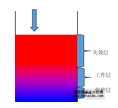當水流首先接觸的上層交換劑失效后,繼續(xù)進入的原水就與下一層交換劑進行離子交換,從而使工作層不斷下移。整個交換劑層便分為三個區(qū)域。隨著交換劑的運行,失效層的區(qū)域不斷增大,工作層不斷下移,未交換區(qū)域隨之減少。