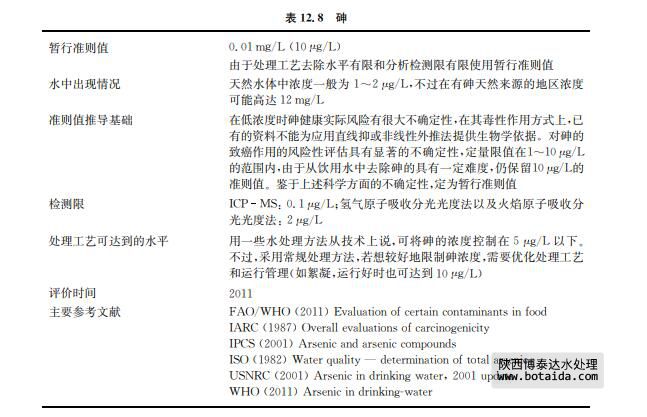 砷的實(shí)際定量極限是1~10μg/L,并且在許多情況下去除砷到達(dá)10μg/L以下的水平 非常困難。由于實(shí)際飲用水工藝中(尤其供水規(guī)模較小情況下)去除砷十分困難,以及定量 的檢測限水平較高,將10μg/L保留作為濃度控制目標(biāo)和暫行準(zhǔn)則值。