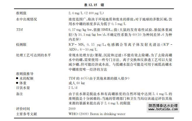 硼的化合物可用于制造玻璃、肥皂和清潔劑,并可用作阻燃劑。地下水中硼的天然來源 主要是由于含有硼酸鹽和硼硅酸鹽的巖石或土壤的浸出。地表水中硼含量會由于污水的排 入而增加,但這種作用的排污量以及污水中硼的平均含量已經(jīng)明顯減少(見表12.15)。