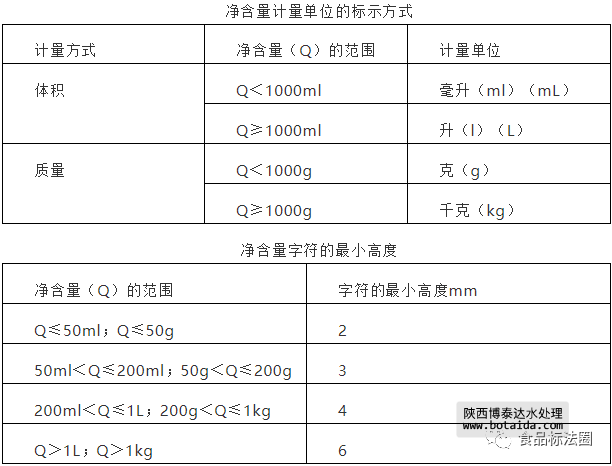 凈含量應(yīng)依據(jù)法定計量單位標(biāo)注,分別質(zhì)量單位[克(g)、千克(kg)]和體積單位[升(l)(L)、毫升(ml)(mL)]。固態(tài)食品只能標(biāo)示質(zhì)量單位,液態(tài)、半固態(tài)黏性食品可以選擇標(biāo)示體積單位或質(zhì)量單位。
