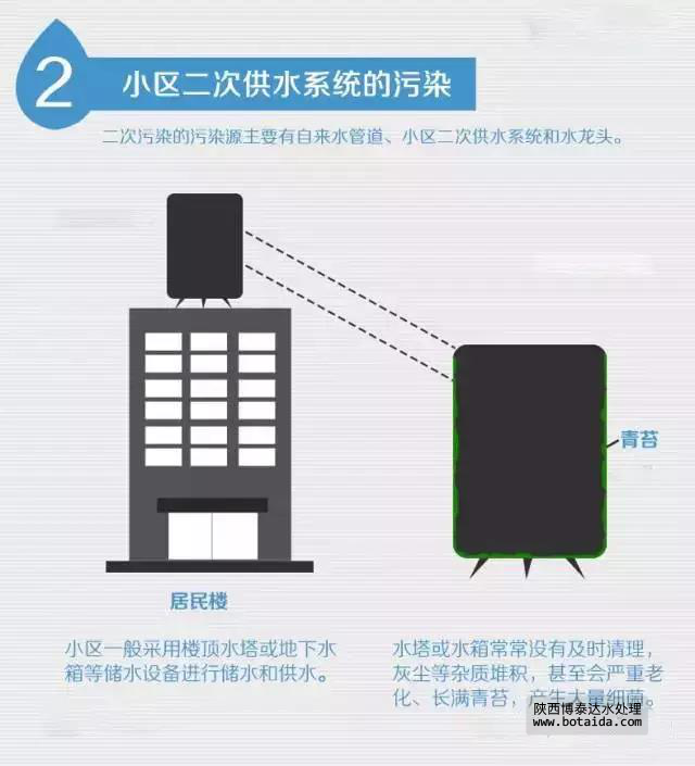 小區(qū)一般采用樓頂水塔或地下水箱等儲水設(shè)備進(jìn)行儲水和供水。而水塔或水箱常常沒有及時清理,灰塵等雜質(zhì)堆積。有的儲水設(shè)備甚至?xí)?yán)重老化、長滿青苔,產(chǎn)生大量細(xì)菌滋生。