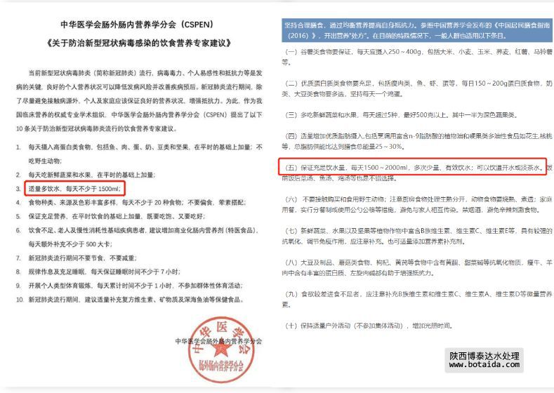 中國營養(yǎng)學(xué)會、中華醫(yī)學(xué)會、地方衛(wèi)健委等機構(gòu)發(fā)布的“防治新冠病毒感染的飲食指南”中,也多次提到要保證每天1500ml~2000ml的飲水量,多次少量,有效飲水。
