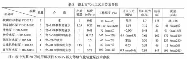 燒嘴冷卻水泵、鎖斗循環(huán)泵、渣池泵、激冷水泵(或灰水循環(huán)泵、黑水循環(huán)泵)、低壓灰水泵、高壓灰水泵(或稱除氧水泵、高壓回水泵、碳洗滌塔給料泵)、過濾機給料泵等是氣化裝置的關(guān)鍵用泵。