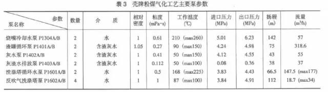 表3為某油改煤項目Shell粉煤氣化工藝主要泵技術(shù)參數(shù)。燒嘴冷卻水泵、渣池循環(huán)泵、灰水泵、灰渣水排放泵等在氣化裝置中屬于重點泵設備。同水煤漿氣化裝置類似,這些泵工作的環(huán)境都很劣。進口壓力高、溫度高、輸送的介質(zhì)中含有煤灰固體顆粒,或者幾項情況同時存在。從目前裝置上設備使用情況看,所需泵都能在國內(nèi)解決,只是使用壽命長短問題。雙相鋼材料、特殊軸封結(jié)構(gòu)的應用為這些泵的安全運行打下很好的基礎(chǔ)。