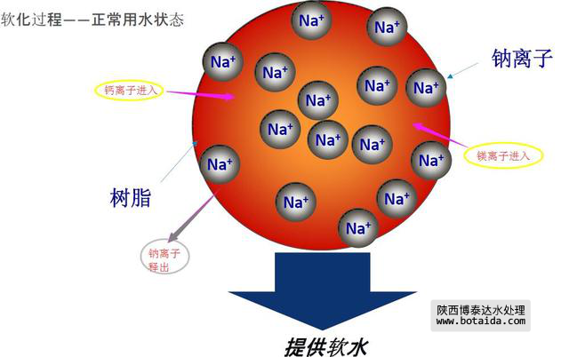 當(dāng)水中的鈣鎂離子含量高時(shí),離子交換樹脂可以釋放出鈉離子,功能基團(tuán)與鈣鎂離子結(jié)合,這樣水中的鈣鎂離子含量降低,水的硬度下降。硬水就變?yōu)檐浰@是軟化水設(shè)備的工作過程。