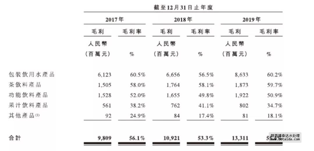 農(nóng)夫山泉的招股書顯示,公司的大類產(chǎn)品毛利率可謂是出奇的高,尤其是包裝飲用水產(chǎn)品,更是高達(dá)60.2%。此外,茶飲料和功能飲料的毛利率也超過50%,分別為59.7%和50.9%。