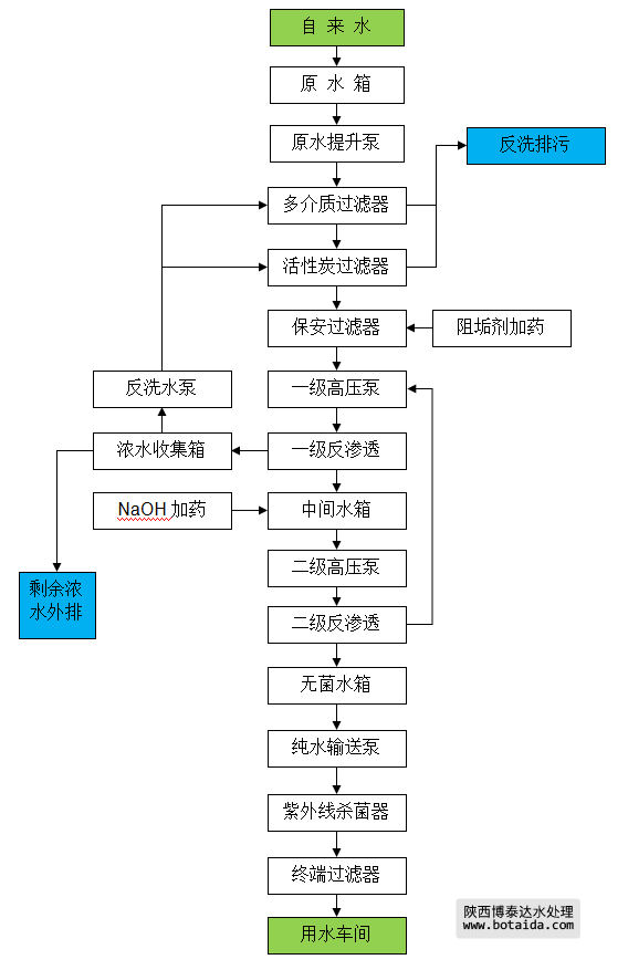 采用“MMF+ACF+雙級(jí)反滲透” 的主體工藝
